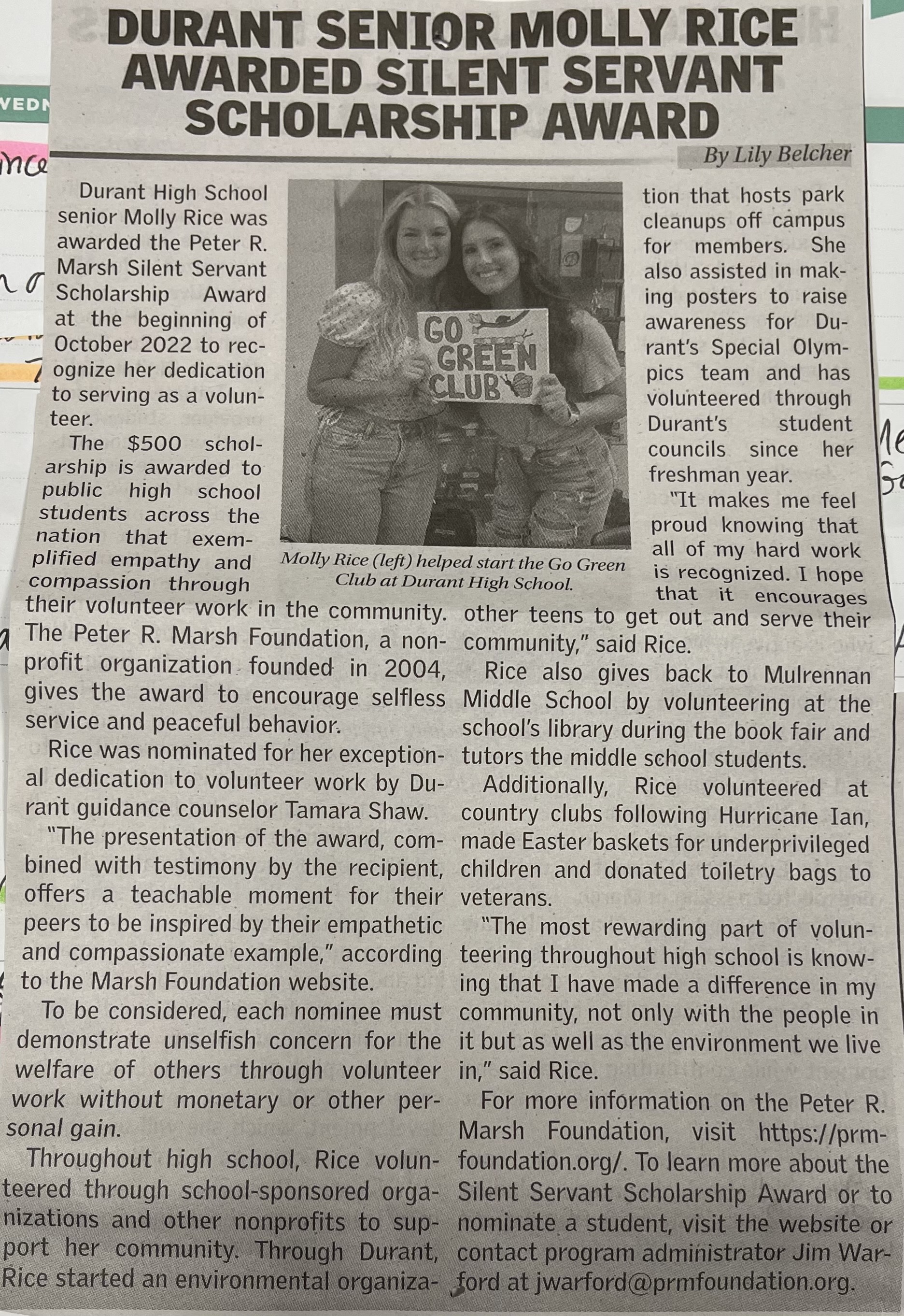 Earlier this year The Peter R. Marsh Foundation recognized Molly Rice at Durant HS in Plant City, FL with our Silent Servant Scholarship Award. Our hope is that schools will use the presentation of our Award to create what we call a “teachable moment” that will inspire other students to experience the personal satisfaction that comes from serving others.