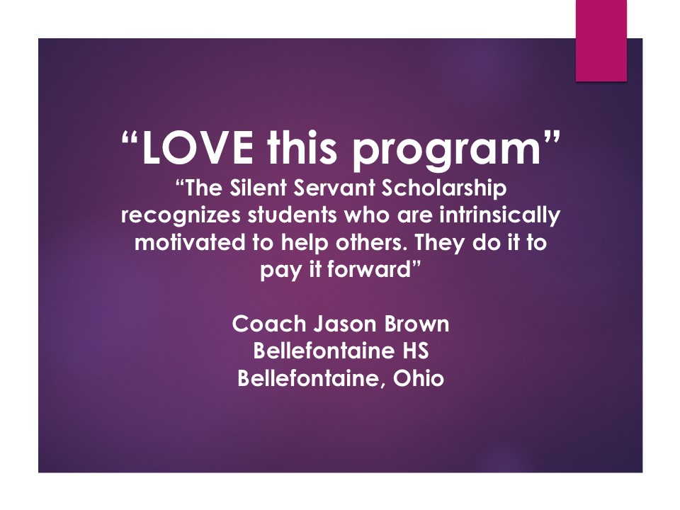 Our Scholarship is not a contest. You know who your Silent Servants are. Schools, counselors, teachers and administrators choose their winners by sending us a Nomination Form. It’s simple, fast and free. All you have to do is fill out this short form: https://www.prmfoundation.org/student-nomination-form/